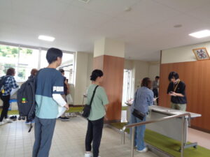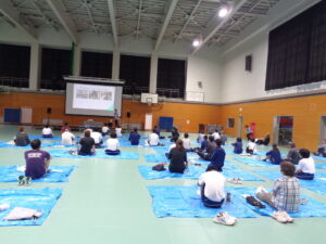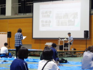 参加者は、避難所での一人当たりの生活スペースとされる約2畳分のブルーシートの上に座り、そのスペースの小ささを実感しながら宮内さんの講演を拝聴しました。参加者から、「被災して2か月後も心のケアが必要なことが分かったが、現状は難しい問題だと思った。」「貴重な話だった。大変さが伝わった」「実際にブルーシートに座ってみて、座っているだけでも大変だと言うことが分かった」「防災教室に参加することで防災について考えることができて良かった」などの感想がありました。