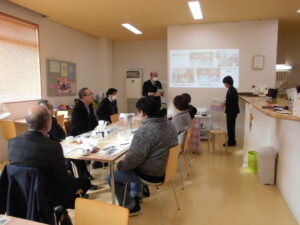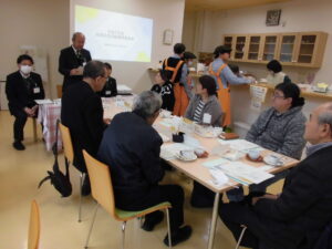 今年度の海老坂地域に関する本校の活動や校外学習、作業学習の様子、防災関係の取組みについて、スライドを使って報告しました。また、委員の皆様から学校への提案や要望についてご意見をいただき有意義な会となりました。加えて、ご参加の皆様には飲み物の注文をしていただき流通・福祉班の生徒の接客学習にもご協力いただきました。