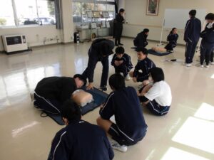 2月19日(木)高岡消防署から救急救命士の瀬川さんと志水さんを講師に迎え、実技救命講習を行いました。事前に℮ラーニングで応急手当WEB講習を受講しており、今回の講習の受講で普通救命講習Ⅰを終了し、救命技能を取得しました。生徒の感想では「今日身に付けたことを、もしもの場面に遭った時には自分ができることをしたい」という声が聞かれました。3年生は4月から社会人となりますが、今日の経験を卒業後の生活に生かしてほしいです。